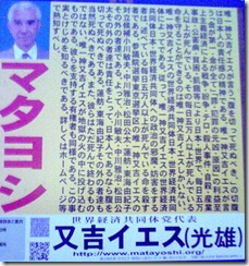 立川駅前の選挙掲示板に先週はなかった大量の文字が書かれた黄色いポスターがあるのを見つけた。そう、唯一神、又吉イエスである。おまけに隣は必殺仕分け人、蓮舫候補だし。